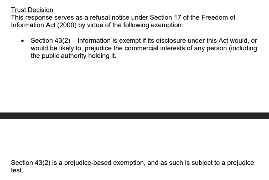The Trust refused the request in full, citing Section 43(2) of the Freedom of Information Act, which relates to commercial confidentiality and non disclosure agreements with landowners.