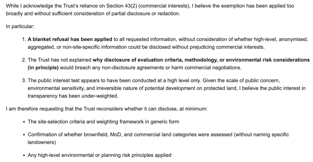 While it is understood that specific site negotiations may be commercially sensitive, the refusal has raised questions about whether more general or anonymised information, such as site selection principles or confirmation that lower impact land types were assessed, could be shared in the public interest.